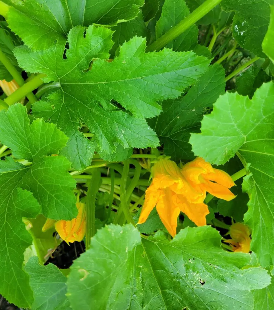 Yellow squash blossoms among broad green leaves